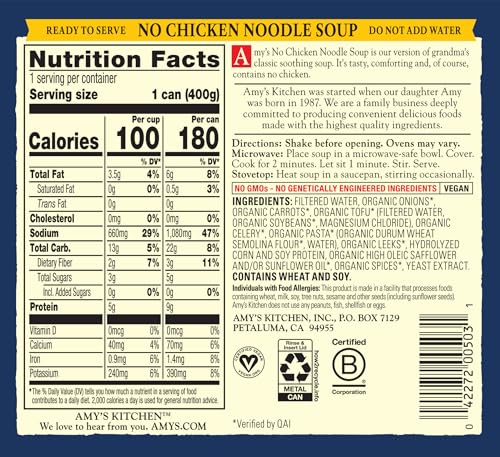 This canned soup contains 9g of plant based protein and 3g of fiber per serving; Amy’s no chicken soup is Non-GMO, Dairy Free, Vegan and Certified Kosher for a high-quality, plant based food everyone can enjoy
