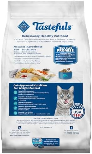 Blue Buffalo Tastefuls Adult Weight Control Cat Food is a delicious dry cat food formulated with real chicken as the first ingredient. A great choice for cat parents who want to prioritize natural ingredients while pleasing picky palates, this Blue Buffalo dry cat food is formulated without any chicken (or poultry) by-product meals, and it is free of corn, wheat, soy, and artificial flavors and preservatives. BLUE Tastefuls cat food is packed with naturally tasty ingredients and key nutrients like L-Carnitine to support natural weight management and lean muscle development, plus fiber to help your cat feel full. This natural cat food will keep your cat purring for more!