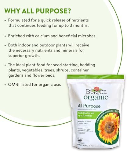 FEED YOUR PLANTS: Burpee’s All-Purpose Organic Plant Food is formulated to keep your plants growing and happy throughout the season. Major nutrients as well as calcium, minor nutrients, and some of the beneficial microbes that help keep the soil and plants healthy are released immediately and continue to feed your plants for up to 3 months.