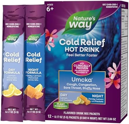 Nature’s Way Cold Relief Hot Drink, Umcka, Homeopathic, Clinically Proven Pelargonium Sidoides 1X, for Cough, Congestion, Sore Throat, Stuffy Nose, Day & Night Formula, 12 Packets (Packaging May Vary)