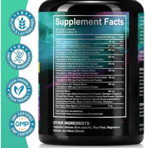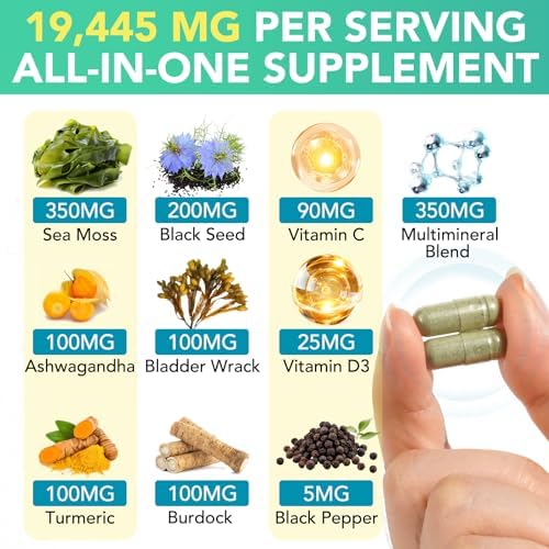 Rich in Nutrients: Sea moss capsules are made with sea moss and ashwagandha, a multimineral blend. Each capsule delivers 19,445 mg of powerful ingredients, providing a range of benefits such as boosted immunity, reduced inflammation, enhanced energy, balanced stress levels, and improved skin and hair health.